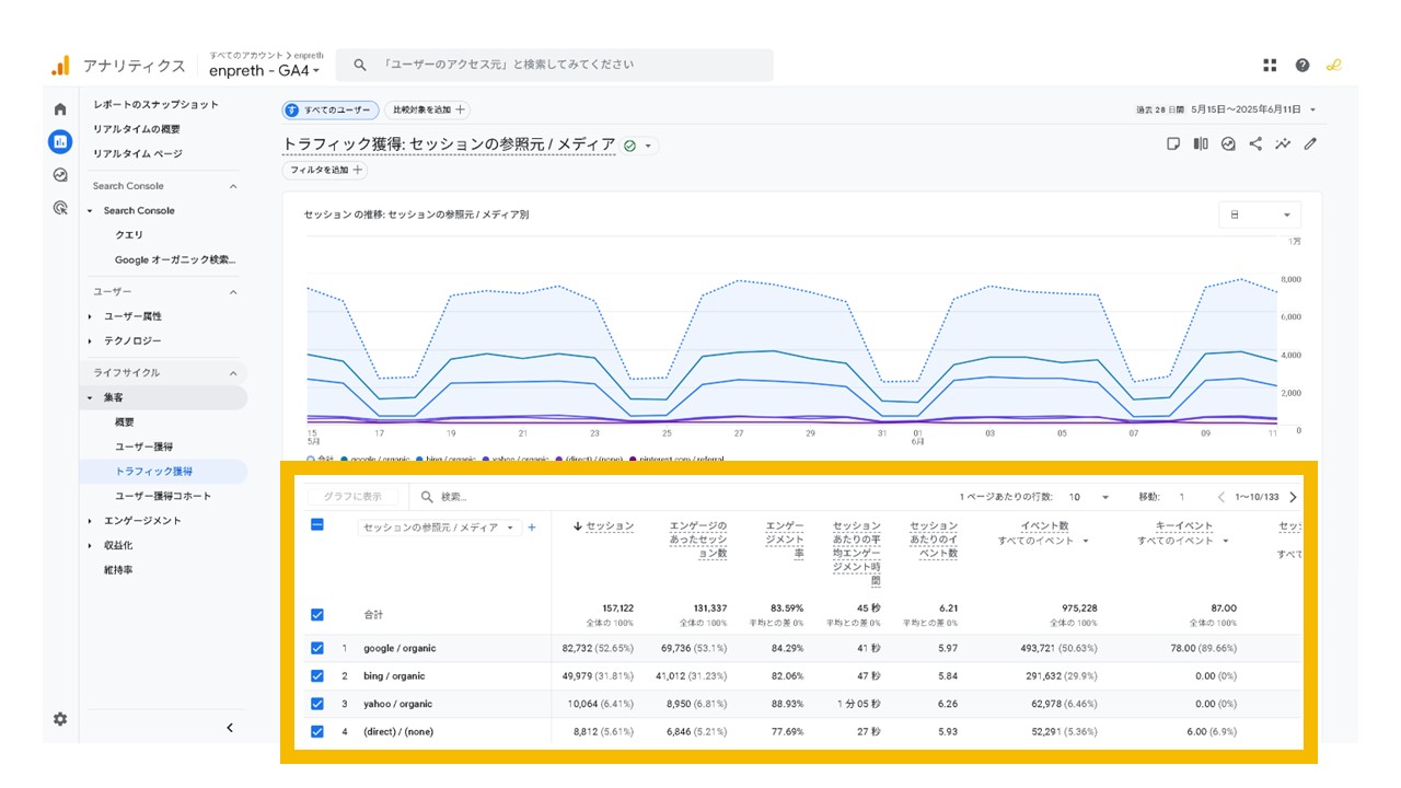 ![STEP3:ライフサイクルの[集客]をクリック](https://enpreth.jp/wp-content/uploads/2025/06/ga4-ai-traffic3.jpg)
