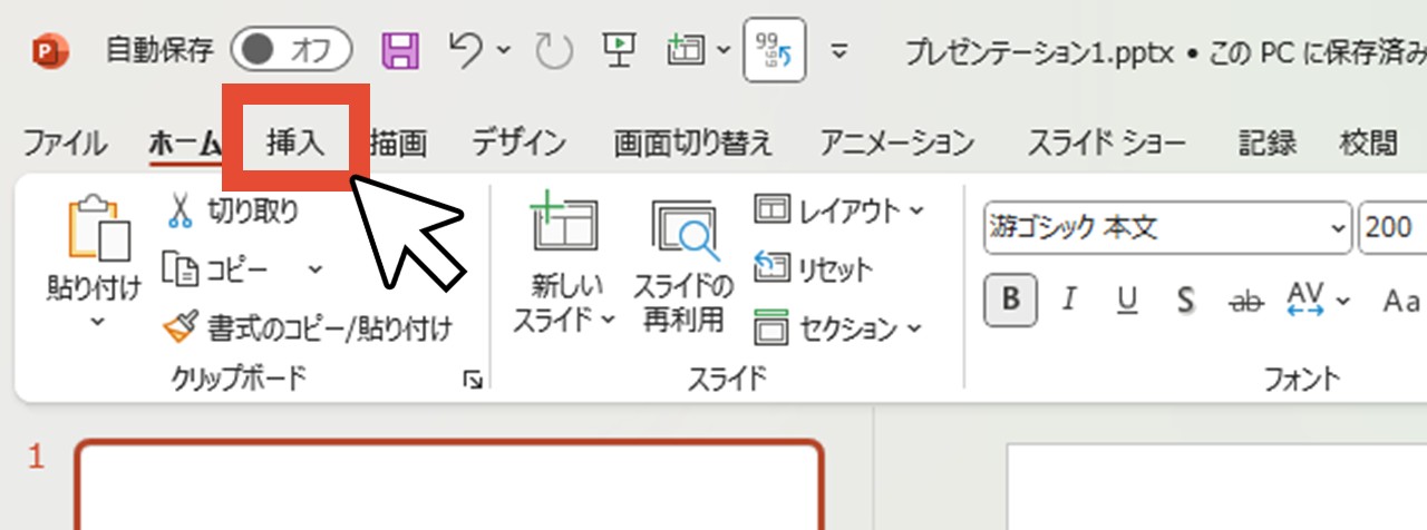 1.「挿入」をクリック