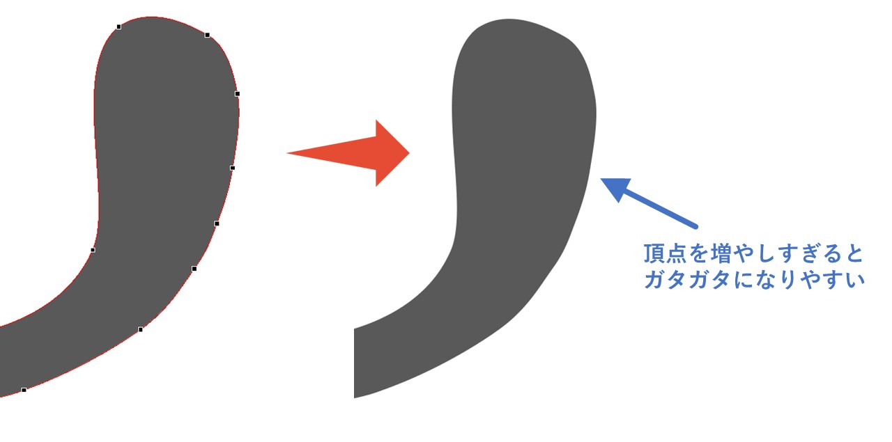 特に、長いストロークで緩やかなカーブを作りたい時などは、カーブの中にたくさん頂点があると、頂点の数だけカーブがガタガタになりやすいです。