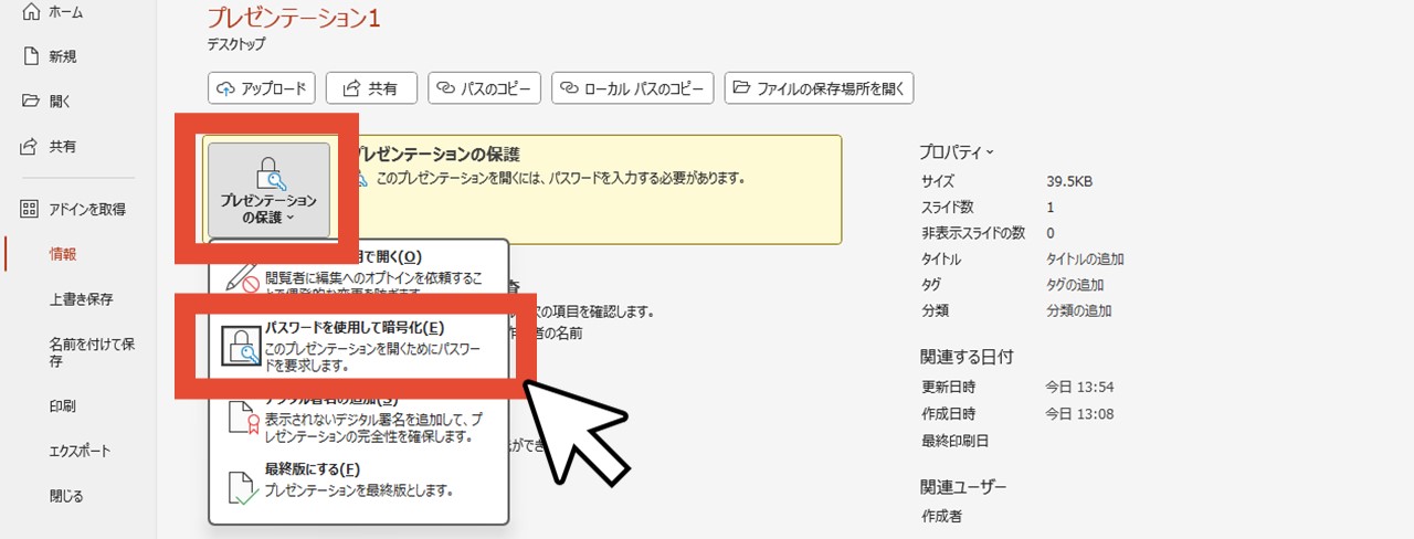 「プレゼンテーションの保護」で「パスワードを使用して暗号化」を選択します。