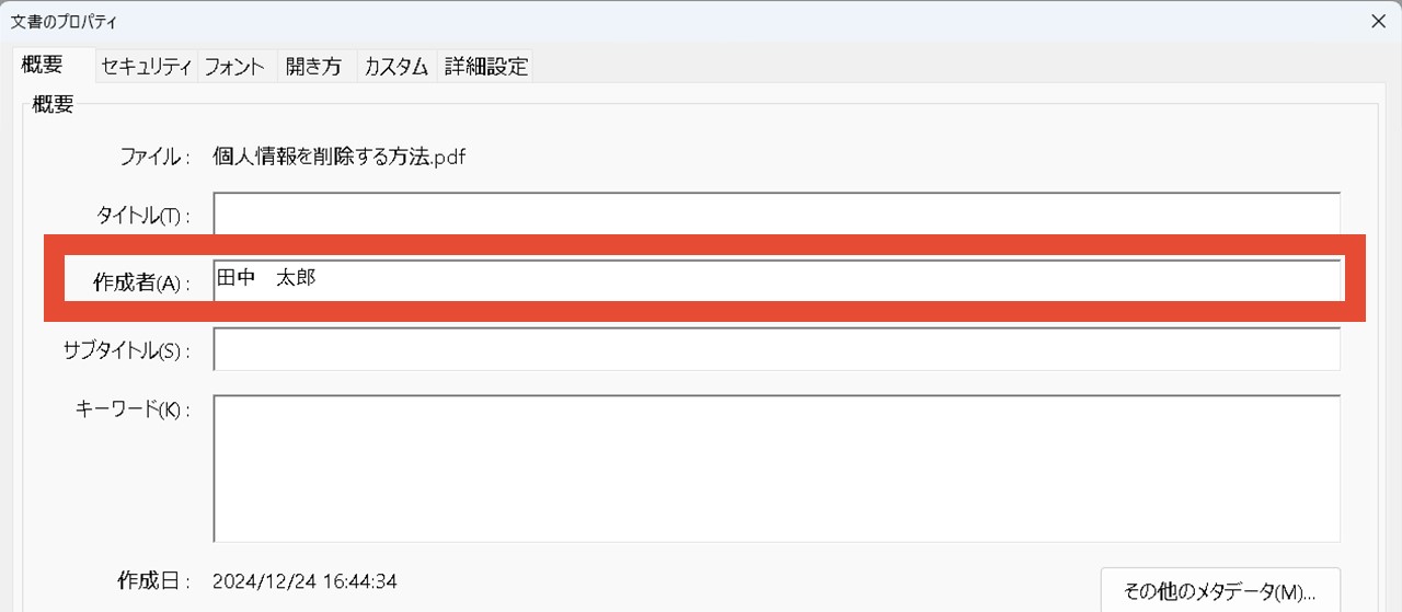 また、今開いているのは元のファイルなので、STEP3のプロパティ画面を見てみると個人情報は消えていません。