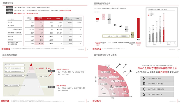 | ポイント | GRCSさんの決算説明資料では、伝えたい情報に合わせて円や三角形などを使い、視覚的に分かりやすくしています。また、薄い色の枠で情報を囲むことで、隣の情報と関係性は持たせつつも区別され、簡単なデザインなので参考にしやすいです! |